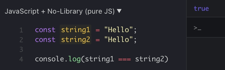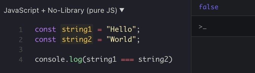 To compare if two string values are equal to each other, use the code below. If the strings are equal, the result will be “true,” but if they are not equal, the result will be “false.”